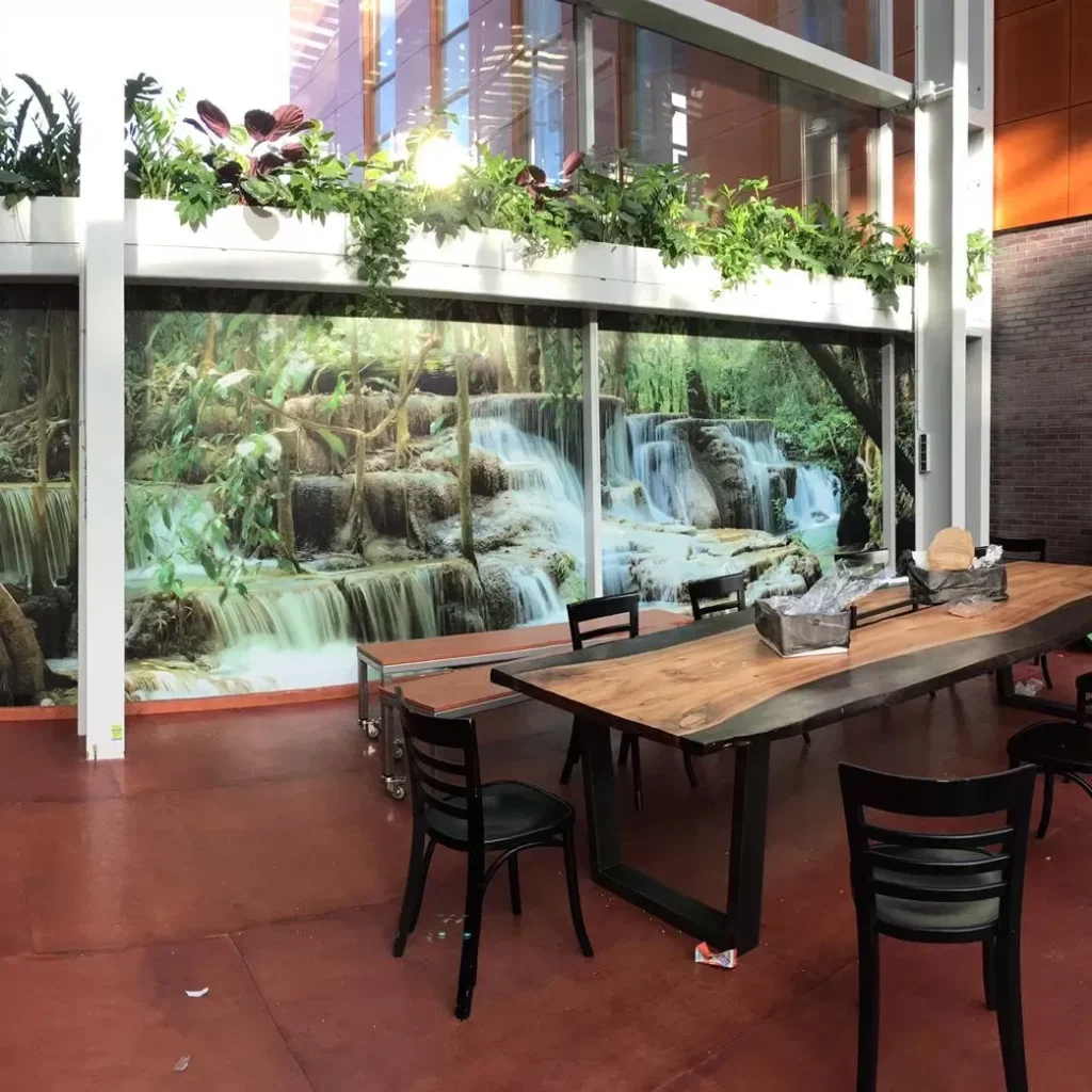 - Versterking van je merkidentiteit: kies voor een op maat gemaakte wandvisual met jouw logo, slogan of kernwaarden voor herkenbaarheid.